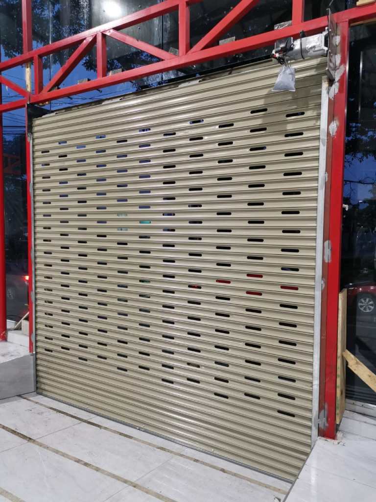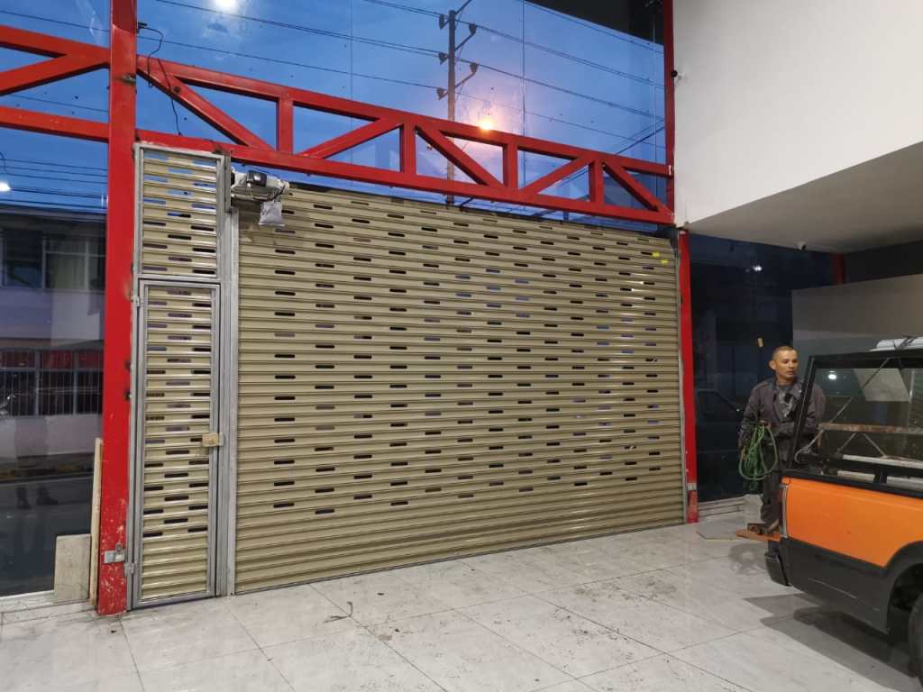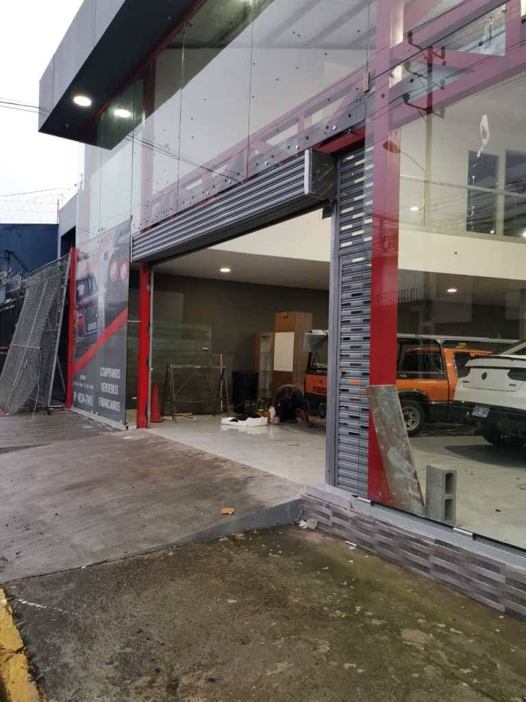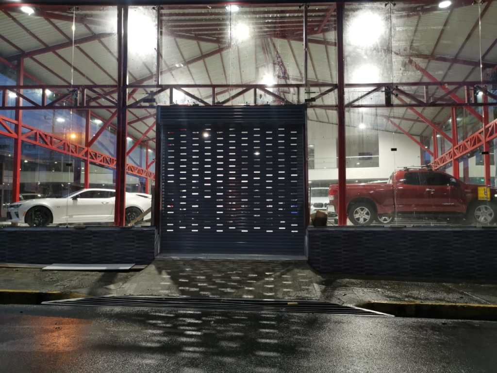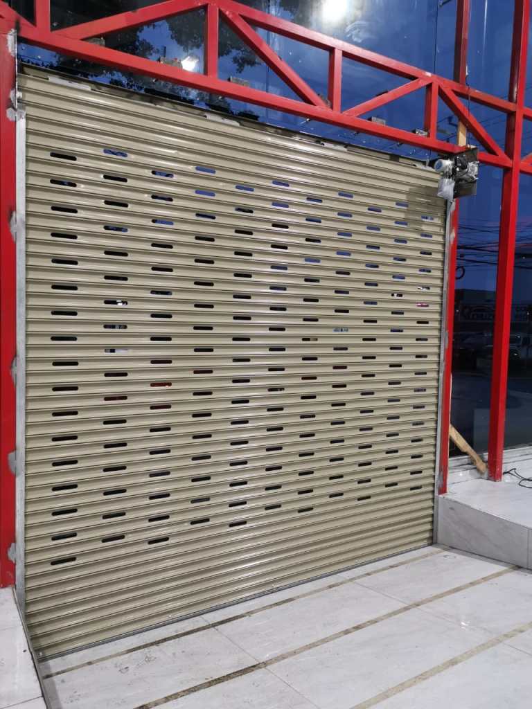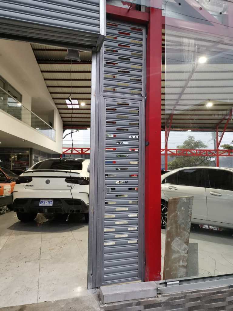 Descripción: Cortina residencial de garaje con puerta al centro. Fabrica en lámina esmaltada perforada. Funcionamiento por motor motorreductor, con capacidad para 300 kilogramos. Incluye dos controles remotos y botonera interna de tres tiempos.