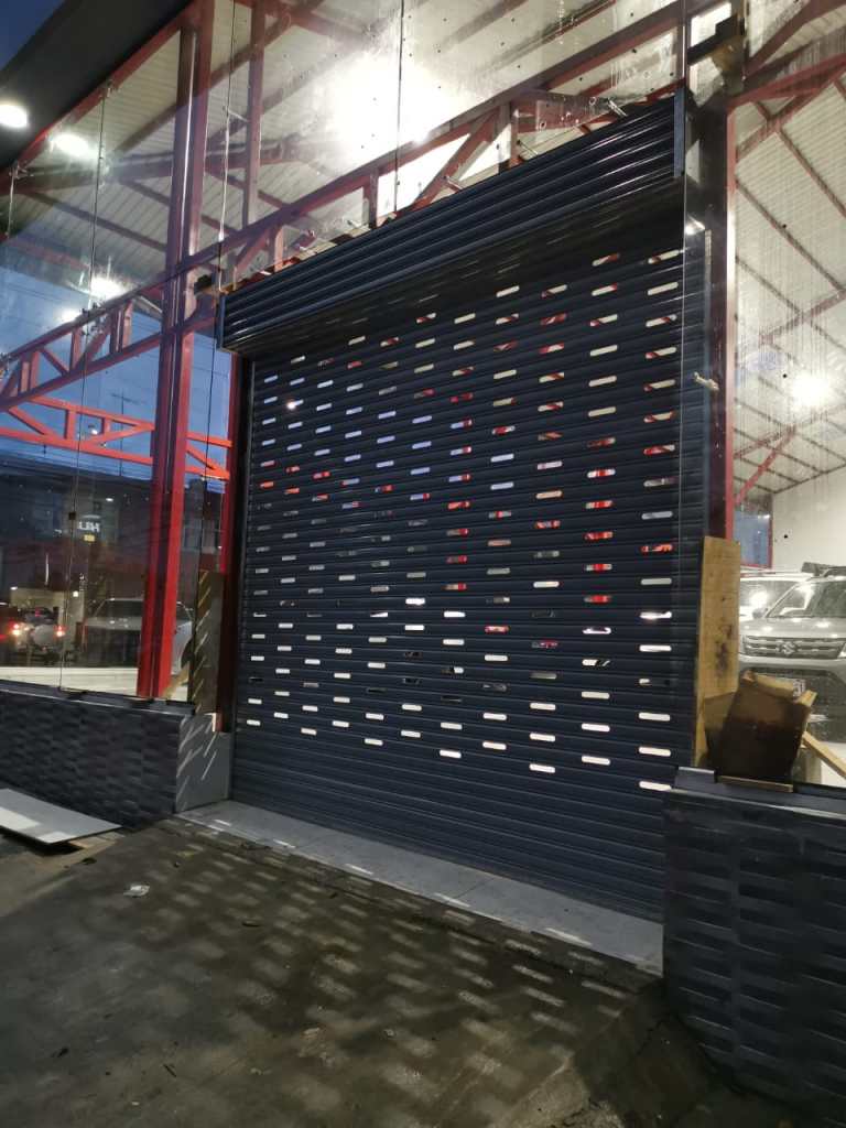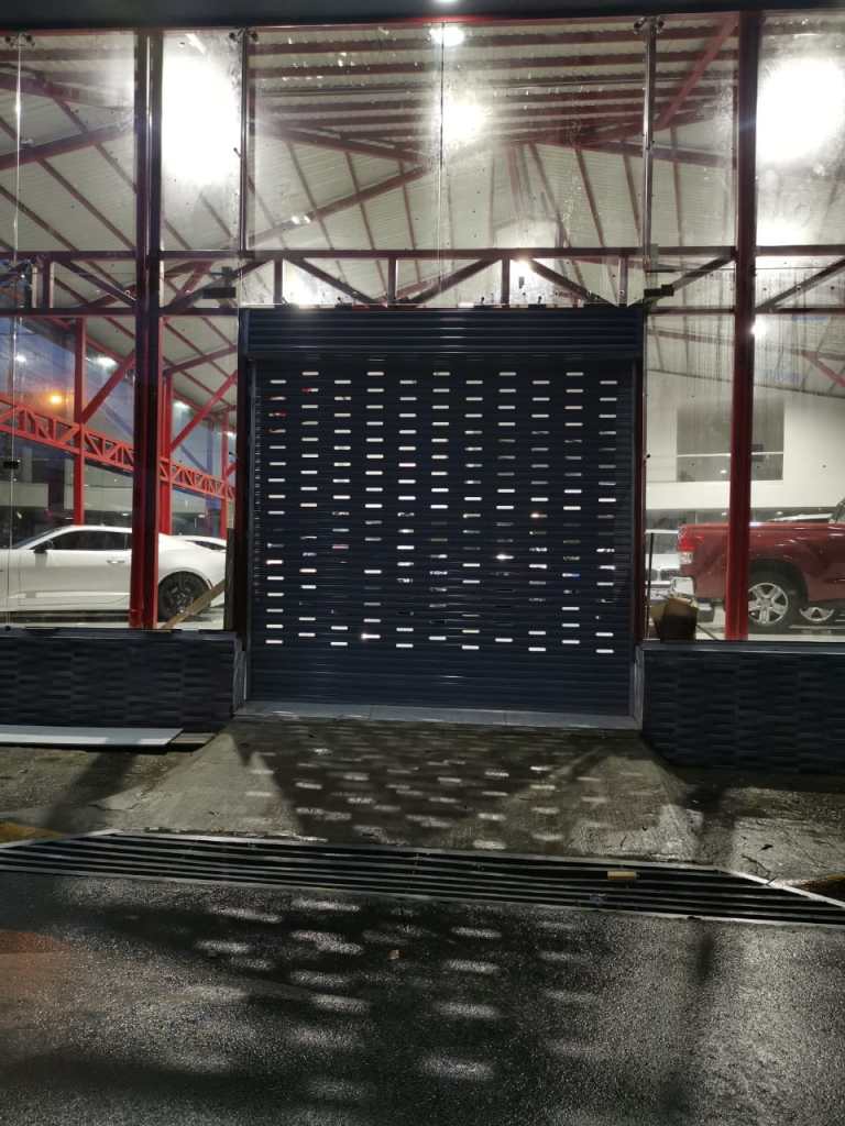 Descripción: 2 cortinas eléctricas con perforado ovalado, en esmaltado calibre #22. Particularmente, al centro tiene un portón abatible con una puerta insertada, el cual tiene funcionamiento automático con pistones de uso residencial.