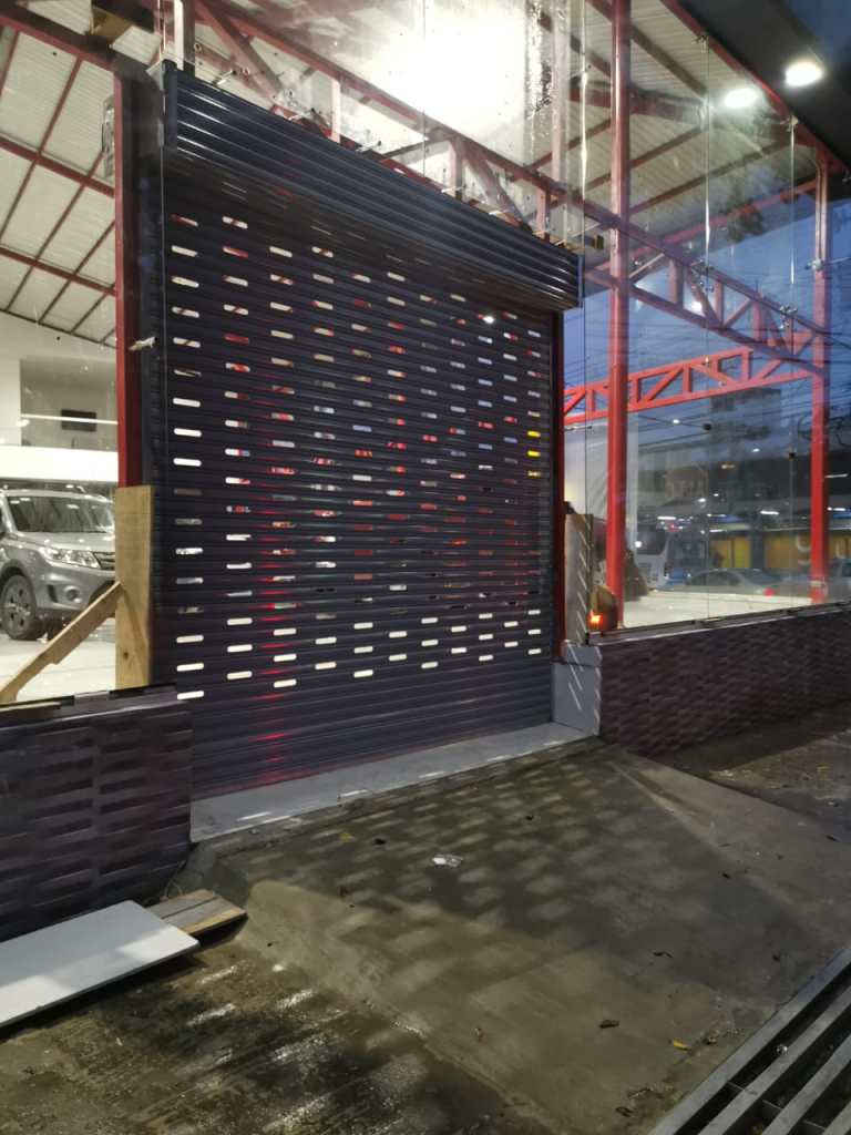 Descripción: Cortina metálica residencial confeccionada en lámina con perforado ovalado esmaltada color café. Puerta estandar de 80 centímetros de ancho por 2.10 metros de alto, con llavín doble paso; fabricada con el mismo material de la cortina para mantener armonía en el diseño. Uso automático.