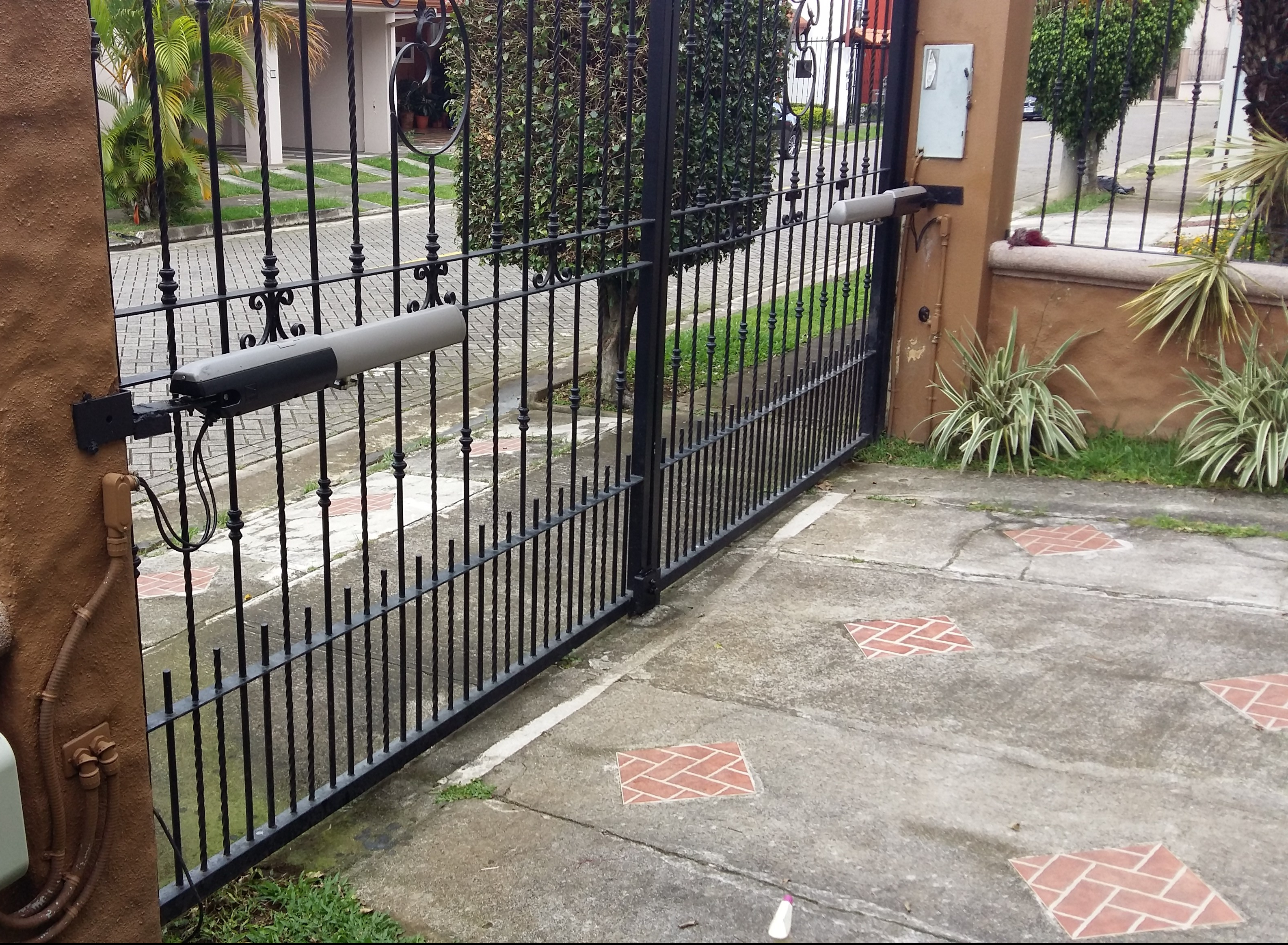 Portón de reja abierto con pistones. El bajo peso de este portón permite la instalación de un motor de una capacidad no muy alta.
